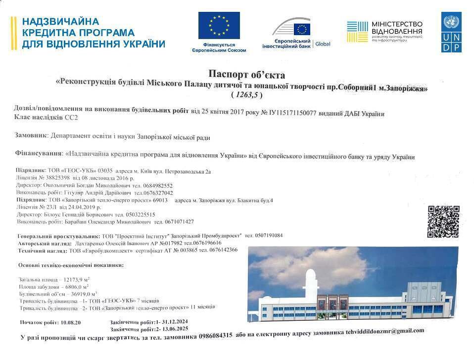 Інформаційна довідка (стисло) по об’єкту: «Реконструкція будівлі Міського Палацу дитячої та юнацької творчості за адресою: пл. Леніна,1 в м. Запоріжжя (коригування)»