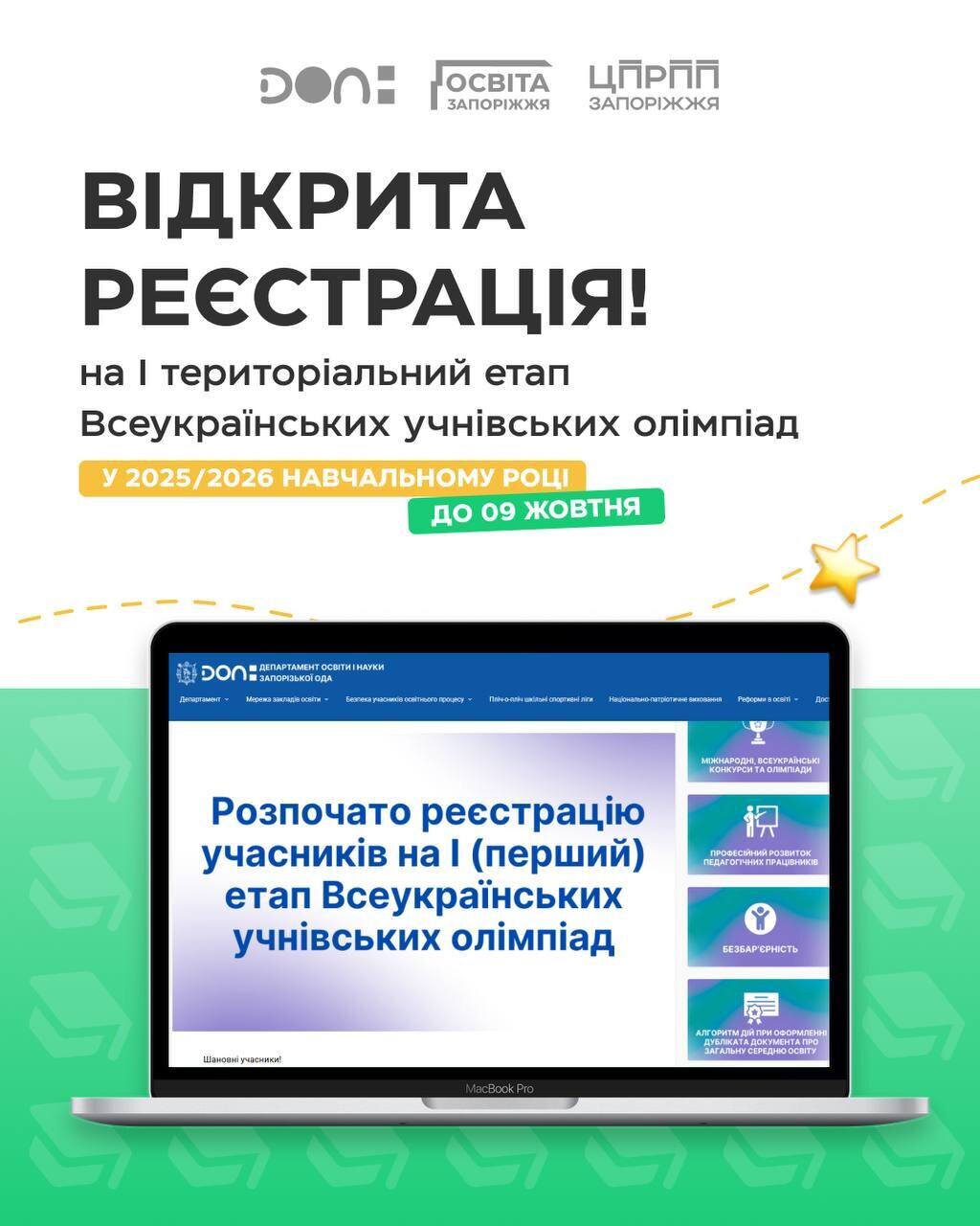 Відповідно до наказів Міністерства освіти і науки України та Департаменту освіти і науки облдержадміністрації триває реєстрація учасників на І (перший) територіальний етап Всеукраїнських учнівських олімпіад з навчальних предметів у Запорізькій області.
