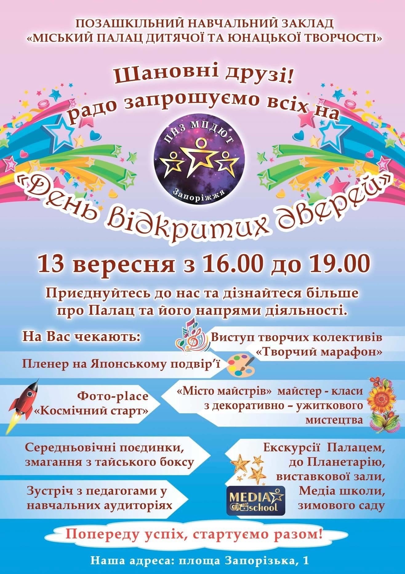 День відкритих дверей у Міському Палаці дитячої та юнацької творчості відбудеться 13 вересня з 16 до 19 години. У цей час на вас чекають майстер-класи, концерт творчих колективів МПДЮТ, екскурсії по Палацу та знайомством з кращими викладачами з позашкільної освіти. Ви зможете вибрати гурток для своєї дитини, записати її та отримати максимум інформації про роботу Палацу.