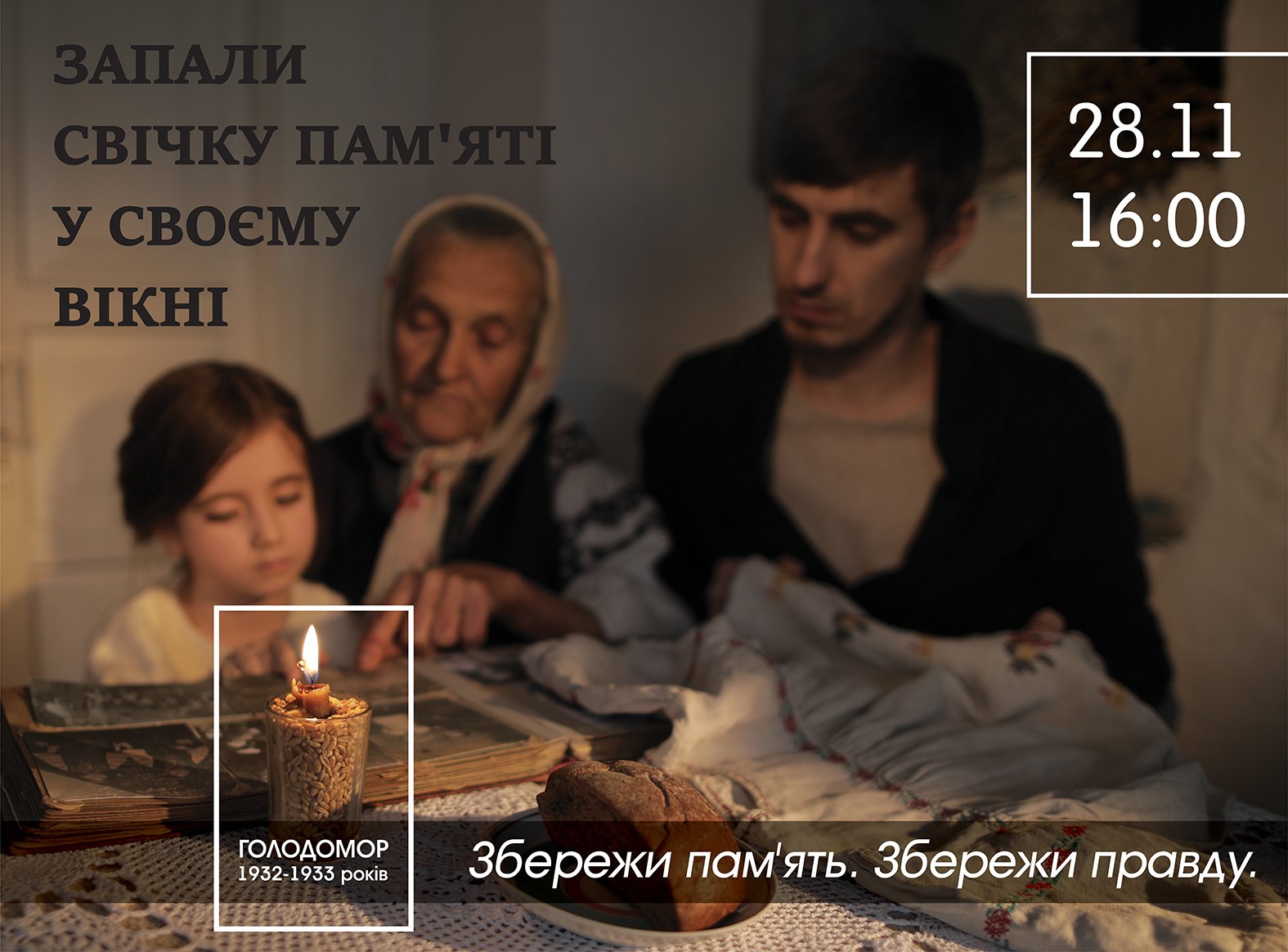 Тому пропонуємо у цьогорічних заходах до Дня пам'яті жертв голодоморів основний акцент робити на родинних історіях, на вшануванні жертв Голодомору у родинному колі. Тому надзвичайно важливо посилити увагу до Акції «Запали свічку» і запалення свічок у домівках. Запалена свічка у вікні кожної нашої домівки увечері 28 листопада стане виявом нашої пам'яті і віри у майбутнє.