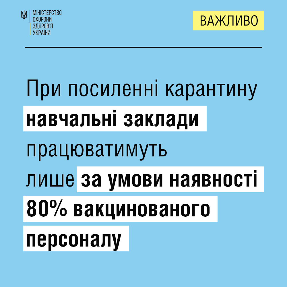 Міністерство охорони здоров'я України повідомляє: у разі переходу області до жовтого, помаранчевого чи червоного карантинного рівня епідемічної безпеки для роботи навчального закладу потрібно мати мінімум 80% повністю вакцинованого персоналу. Про це йдеться у постанові №1236 від 9 грудня 2020 року, зміни до якої ухвалив Кабінет Міністрів України 28 липня.