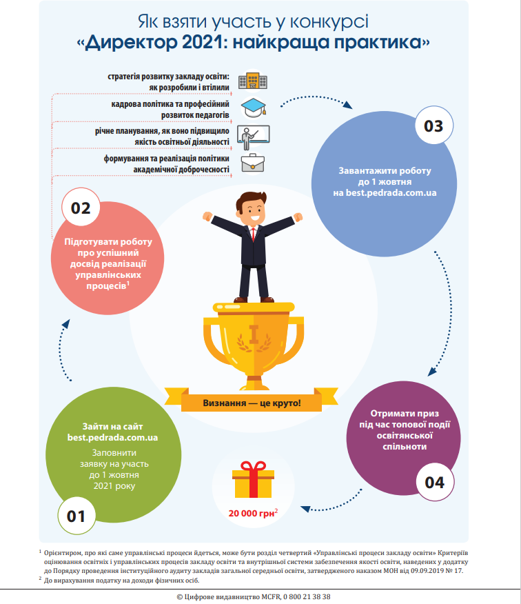 Розпочався ІІ Всеукраїнський конкурс «Директор 2021: найкраща практика» для керівників закладів загальної середньої та дошкільної освіти, організований партнерами Державної служби якості освіти України Цифровим видавництвом МЦФЕР.