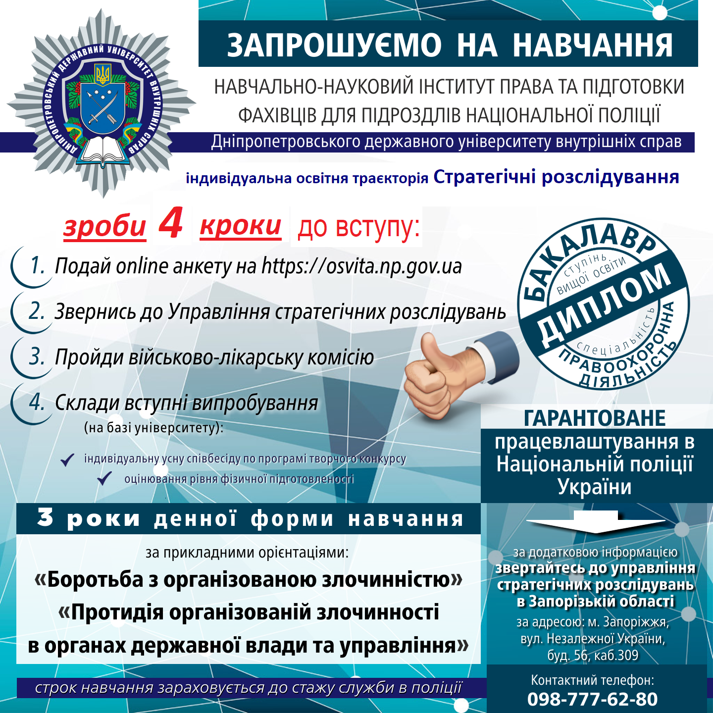 Навчання у Навчально-науковому інституті права та підготовки фахівців для підрозділів Національної поліції Дніпропетровського державного університету внутрішніх справ за спеціальністю 262 «Правоохоронна діяльність», індивідуальною освітньою траєкторією Стратегічні розслідування здійснюється на основі повної загальної середньої освіти, за державним замовленням, денною формою навчання та прикладними орієнтаціями: