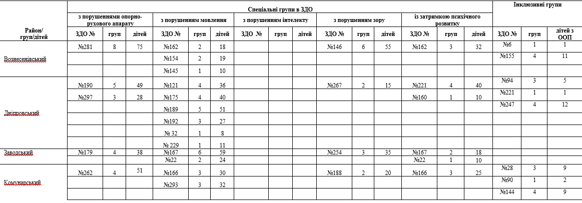 У 2021/2022 навчальному році у закладах дошкільної освіти м. Запоріжжя забезпечено функціонування 161 спеціальної групи для 1880 дітей з особливими освітніми потребами (порушення зору, мовлення, опорно-рухового апарату, інтелекту, із затримкою психічного розвитку).